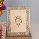Introducing the Florence Wedding Picture Frame—an exquisite union of classic design and contemporary luxury, available in both gold and silver finish pewter. The acanthus leaf pattern, richly encrusted with hand-set clear European crystals, adds a touch of opulence to your cherished memories. The Florence frame, with its elegant gray hued moiré silk back, is a timeless piece that effortlessly blends sophistication with modernity. Available in three sizes—4x6, 5x7, and 8x10 frame—caters to various photo dimensions, making it a perfect choice for weddings and gift-giving. Elevate your gifting experience with this versatile and elegant piece, a beautiful addition to crystal picture frames that capture the essence of treasured moments.