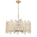 Introducing the Equilibrium Gold Chandelier—a luminous masterpiece that brings modern sophistication to your home. Inspired by the art of balanced design, this chandelier light fixture features gracefully staggered metal strips that culminate in delicate intersections, each adorned with sparkling glass beads and clear crystals. Finished in a warm, sumptuous gold with polished accents, it casts a captivating, ambient glow that transforms your dining room into a sanctuary of elegance. Perfect for elevating your décor, this modern chandelier marries artistic flair with functional brilliance. Embrace the harmonious interplay of light and design, and let the Equilibrium chandelier become the dazzling centerpiece of your home.