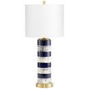 The standout composition of this table lamp is reminiscent of the 1920's elegance. Highlighted by a striped, blue, and brush-stroked white finish on the ceramic frame, balanced on top of an elegant brass base, the Bristle Brush Desk Lamp is as complete a grand luminary as you will find. This blue and gold lamp boasts a generous proportion in its white linen shade, with a single 100w medium base bulb to provide ample illumination from the dimmable light source. These combined make the Bristle Brush Lamp a perfect choice for any upscale bedroom as a bedside lamp, transitional desk lamp for home office, or a mid-century modern lamp for living room ensemble.
