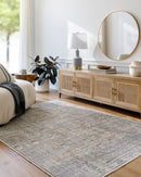 Introducing the Darling washable area rug in tan and black, a unique collaboration between Becki Owens and Livabliss. This updated traditional piece sports an irregular design inspired by vintage one-of-a-kind rugs. Made in Turkey and woven by machine, this contemporary rug is composed of durable polyester, perfect for high-traffic areas. Its palette is a sophisticated blend of earthy tones featuring greys, browns, slate blue, and accents of wheat. In addition to its visual appeal, the Darling area rug boasts practicality - it is easily maintained with machine washing on a delicate cycle and laying flat to dry. For optimal use and longevity, we recommend pairing this piece with a rug pad.